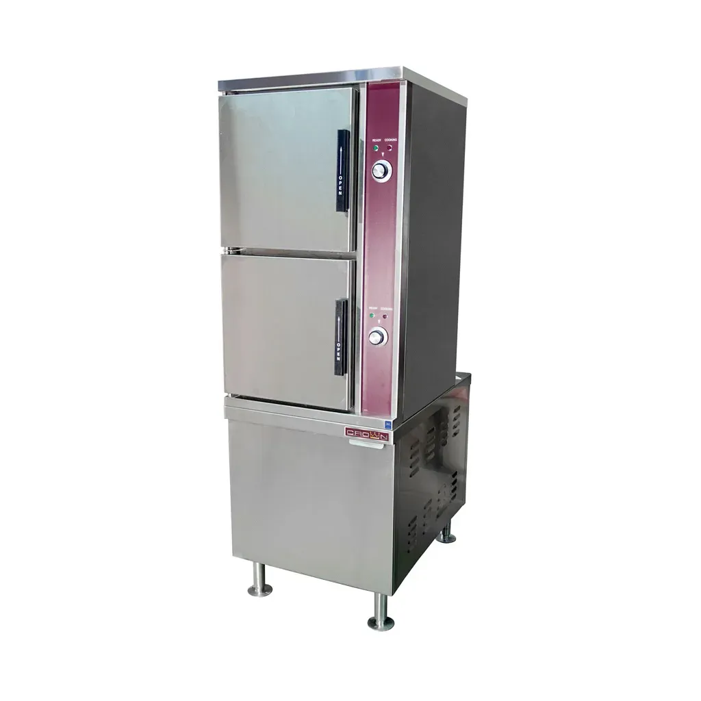 The ECX steamer is expertly crafted from #4 finish type 304 stainless steel, boasting a robust cooking chamber made from one-piece, all-welded 316 stainless steel. This design ensures exceptional durability and performance, with the chamber fully insulated and enhanced by removable stainless steel pan supports. Each door is designed with a removable inner liner of stainless steel, featuring a complete perimeter gasket seal to prevent any leaks. The outer shell is constructed of one-piece, all-welded stainless steel, ensuring maximum strength and hygiene. Additionally, a positive locking and sealing mechanism, paired with a stainless steel drip trough connected to a drain, effectively collects condensate when the door is opened, maintaining a clean and efficient workspace. The steamer's controls are conveniently accessible through a fully removable side panel. Each compartment is equipped with a 60-minute mechanical timer, along with a ready pilot light and cooking indicator. The system is engineered to interrupt steam flow when the door is opened during the cooking cycle for added safety, automatically reactivating when the door is closed. An audible signal clearly announces the completion of the cooking cycle, ensuring optimal efficiency. The cabinet base, featuring an electric boiler and advanced controls, is built with a full perimeter angled frame and reinforced boiler mountings for superior stability. The electric boiler not only provides reliable operation but also includes comprehensive controls within a sleek stainless steel exterior. The hinged doors are equipped with magnetic latches for secure closure, and the unit stands on 6-inch (152 mm) stainless steel legs, which include four adjustable flanged feet for secure attachment to the floor. Standard boiler controls are designed for maximum performance and safety, including automatic water level control, a pressure gauge, a water gauge glass, and operating pressure control with integrated safety features. The system also incorporates a safety relief valve and a cathodic protector. To further enhance efficiency, the unit comes complete with a standard water treatment system, a split water line, CSD-1 boiler controls, and an automatic blowdown feature. Choose the ECX steamer for an unbeatable combination of durability, safety, and innovative technology—designed to elevate your cooking capabilities to the next level.