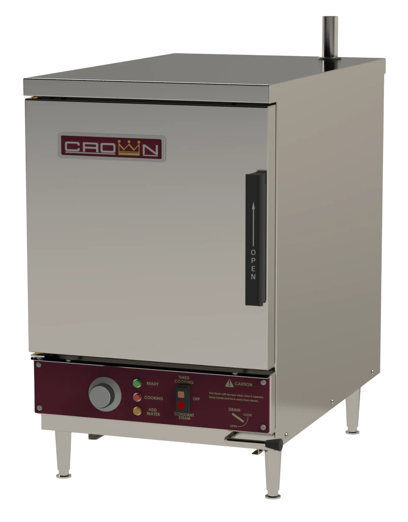 The EPXN-3 (3-pan) and EPXN-5 (5-pan) are countertop, boiler-free convection steamers designed for commercial kitchens that demand high efficiency and ease of use. These units are connectionless, meaning no plumbing is required, offering a flexible solution for kitchens of all sizes. Certified by c-CSA-us and NSF, the EPXN series ensures safety, durability, and top-tier performance. Constructed with a satin-finish 304 stainless steel exterior, these steamers feature a one-piece, welded 316 stainless steel cooking chamber with coved corners for easy cleaning and long-lasting durability. The door is built with a removable inner stainless steel liner and a full perimeter gasket seal to ensure a tight, energy-efficient closure. The outer door liner is made from one-piece welded stainless steel, featuring a positive lock and seal mechanism with a spring release for hassle-free operation. The EPXN units come equipped with removable stainless steel pan supports and a steam diffuser plate, ensuring even steam distribution and consistent results. The control housing is constructed from stainless steel and includes a full-access removable panel for easy maintenance. The controls are designed for ease of use, featuring an illuminated timed cooking/off/constant steam switch, a ready indicator light, a cooking indicator light, and a 60-minute electric timer with an audible alarm that signals the end of the cooking cycle. Additionally, a low water indicator light with an audible alarm alerts the user when water levels are too low. For added safety, a door interlock switch interrupts steam generation when the door is open and automatically reactivates when the door is closed. Perfect for kitchens looking for efficient, high-performance steamers without the need for plumbing, the EPXN-3 and EPXN-5 offer a practical, reliable solution for everyday steaming tasks.