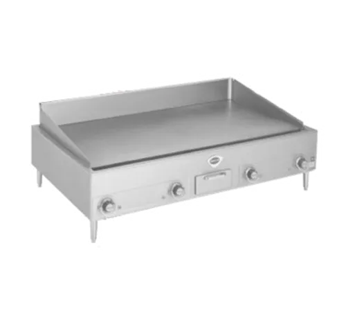 Wells G-24 Electric Countertop Griddle is ideal for any commercial kitchen based on their versatile, easy-to-use design. It features 1/2" thick griddle plate, positive-off thermostats that allow for individual zone temperature control. Enclosed tubular elements are clamped onto the bottom of the griddle plate for even heat distribution over the entire surface. Removable splash guards, removable front grease drawer, protective guard rings to protect the controls, and 4" adjustable legs. 46"W x 24"D cooking surface, 240V