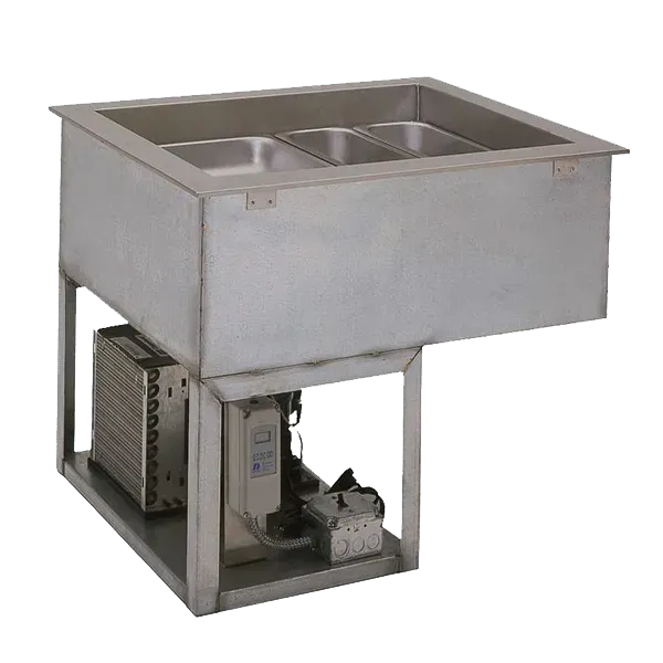 Wells RCP-7400 Refrigerated Drop-In Cold Pans hold pre-chilled food products at cold, fresh, and safe serving temperatures and pans are recessed 3" to comply with NSF-7 Performance requirements. Unit is completely self-contained with individual thermostatic controls, use R-513A CFC free refrigerant system featuring sight glass, and include an 8 ft. cord and plug. One-piece top flange and coved-corner interiors constructed of stainless steel. Exterior body constructed of heavy gauge, corrosion resistant steel. Condensing unit mounted on corrosion resistant frame below the cold pan. Featuring wrapped coil construction on both sides and bottom, on/off switch, easy service valves, dryer/filter and receiver. Condensing unit may be easily removed for service. 1" drain, Four 12" x 20" pans.